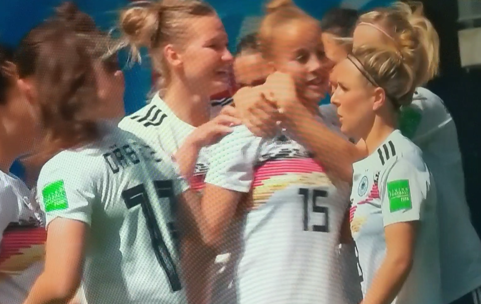 With Stands painted red and white with thousands of supporters from across the globe, the second match of matchday 1 Germany vs China PR kicked off with a bang!Germany, as expected given their experience and talents, dominated from the start and an early cross in the second minute but Poop seemed glorious! Another beautiful shot came near the third minute when Dräbitz tried a long shot from outside the box, but shooting wide.The early minutes saw some brisk, precise attacks by the German side, but Wang Shan Shan rose as China’s hero at all times. Some amazing sliding tackles and interceptions ! But a little rough play ended her with the game’s first Yellow card in the 10th minute.