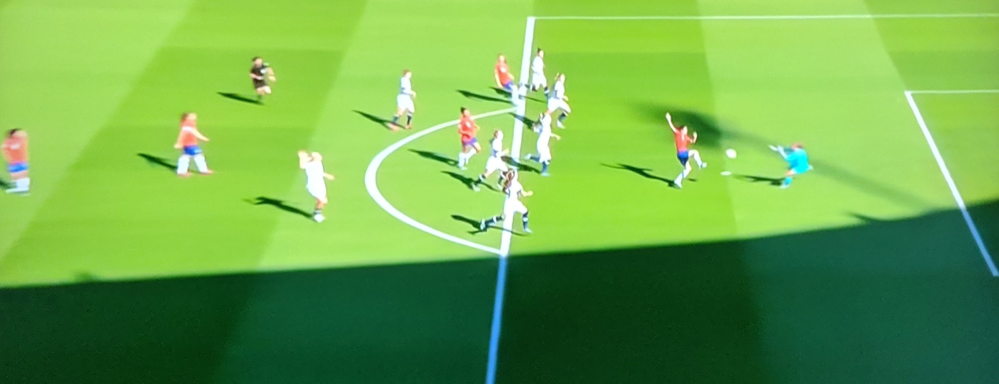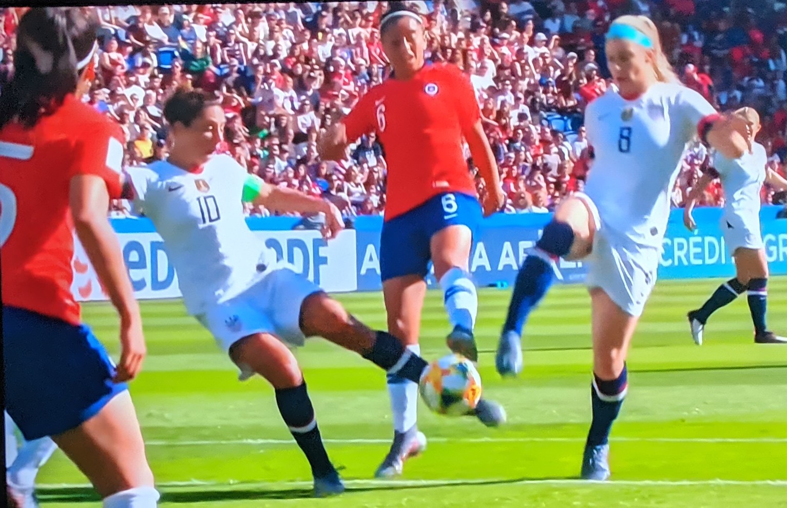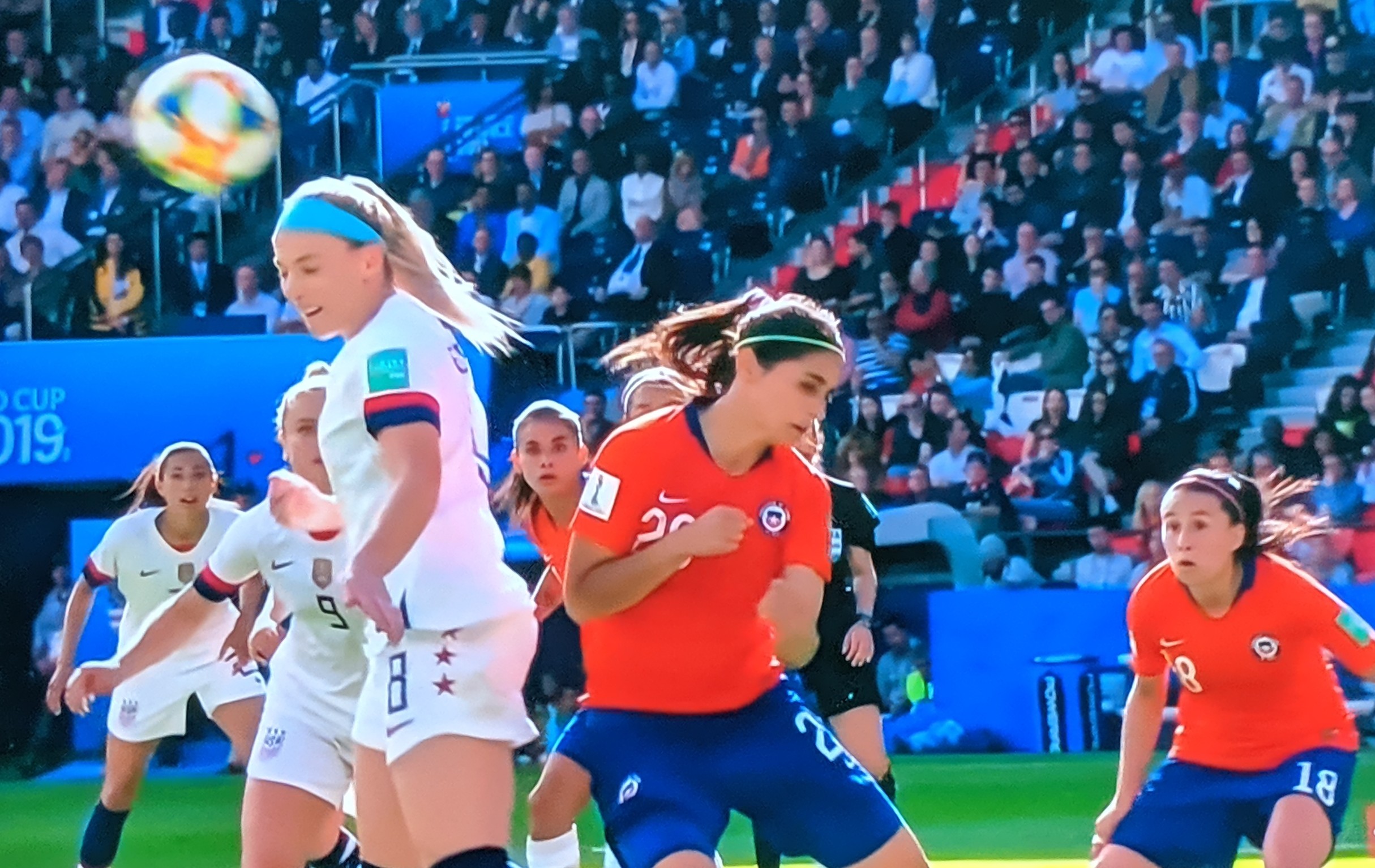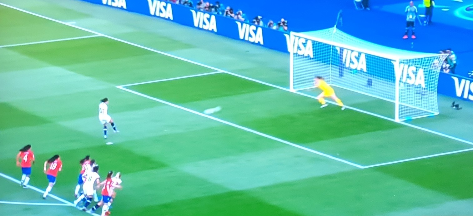 USA won another set piece free kick as Francesca Lara was handed a yellow card for challenge on Lloyd. Press took it, Chile cleared it but VAR came in to check for a Penalty- VAR might have as well stepped in to deny an illegal corner USA that led to their second goal.The referee checked it and awarded a Penalty- to USA, yellow card to Huento for a supposed challenge on Long, as the crowds booed on. And to Chile’s delight, Lloyd MISSED THE PENALTY!!! She shot it to her left and wide! Karma.