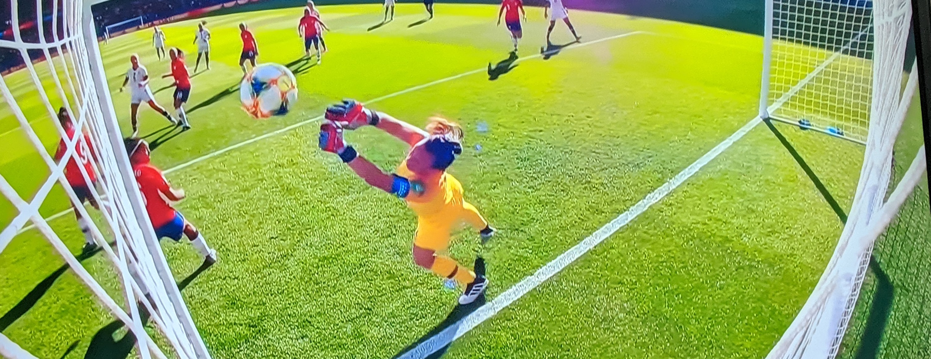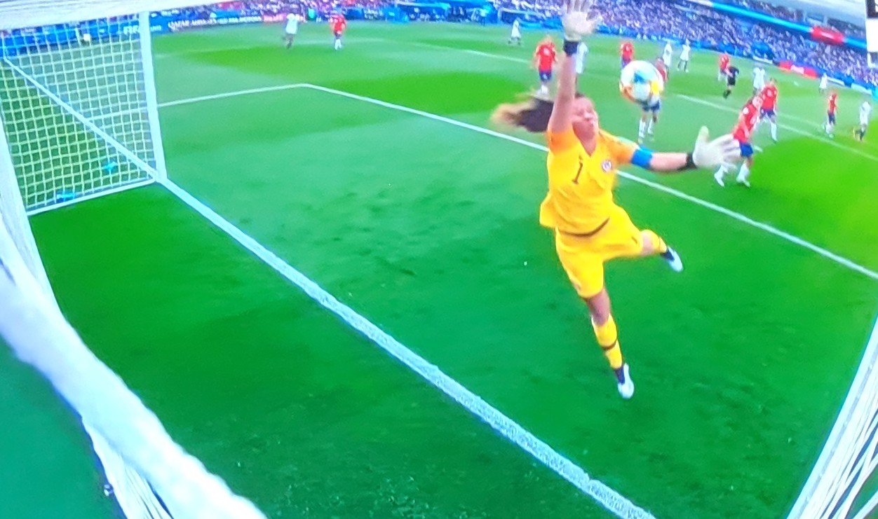 And yet again, Endler denied Press by pinching away her shot aa USA colonized Chile’s box but The Reds were just tooooo good this time!Endler moved to her right and thumped away Press’s effort effortlessly! 😀