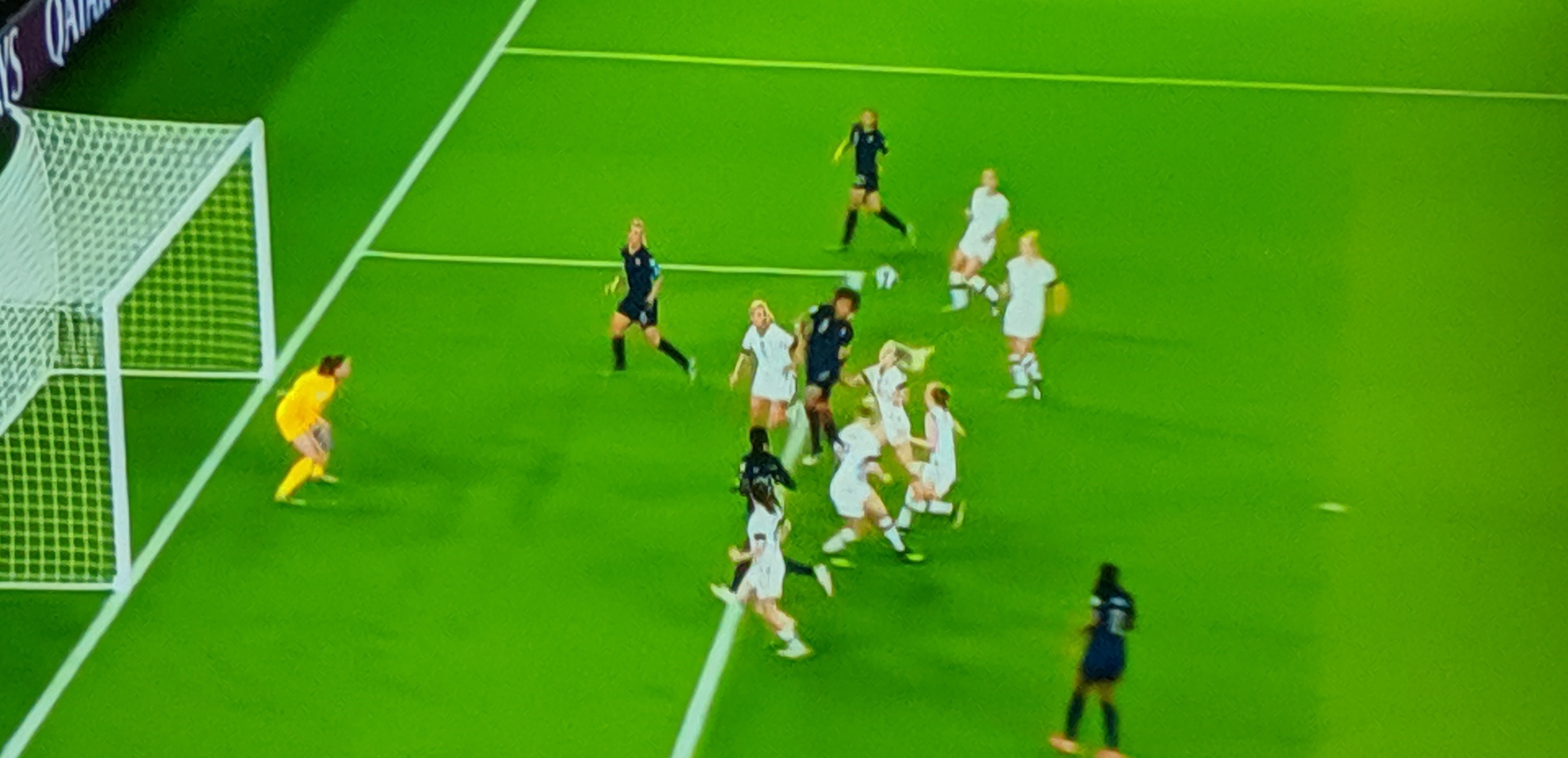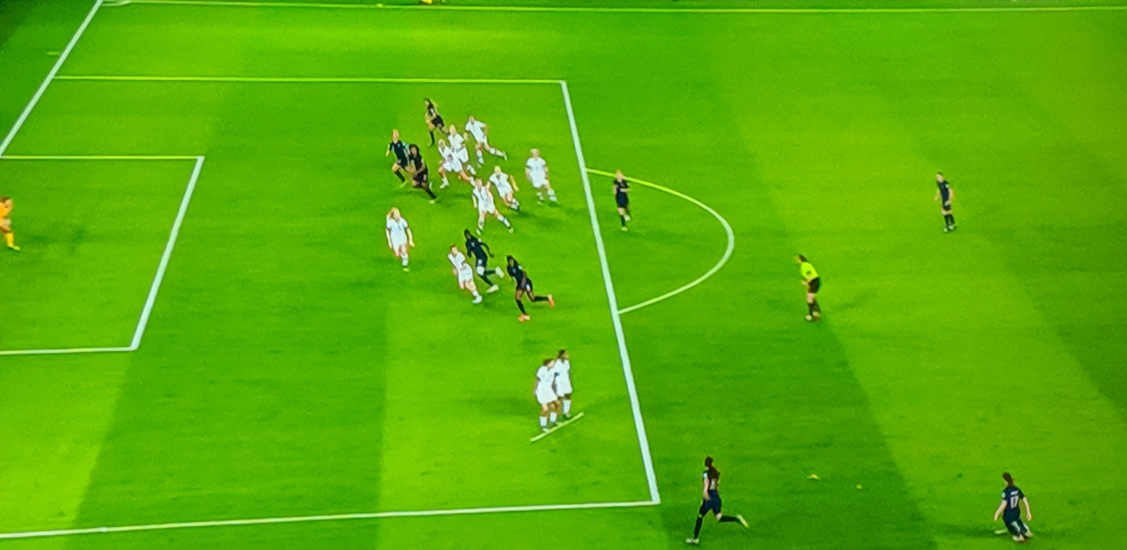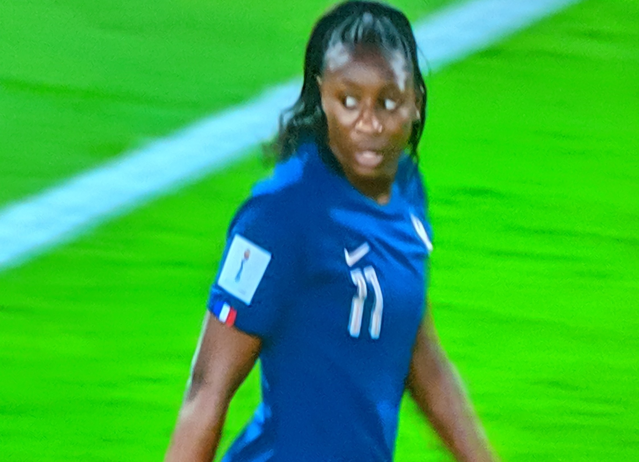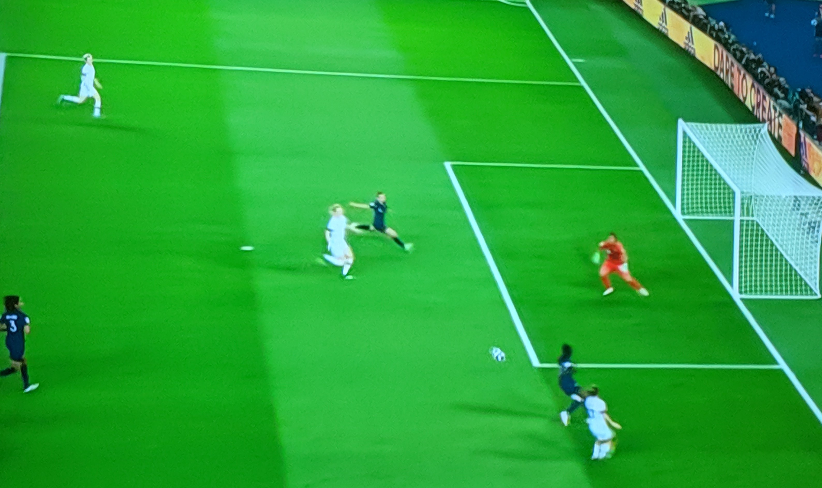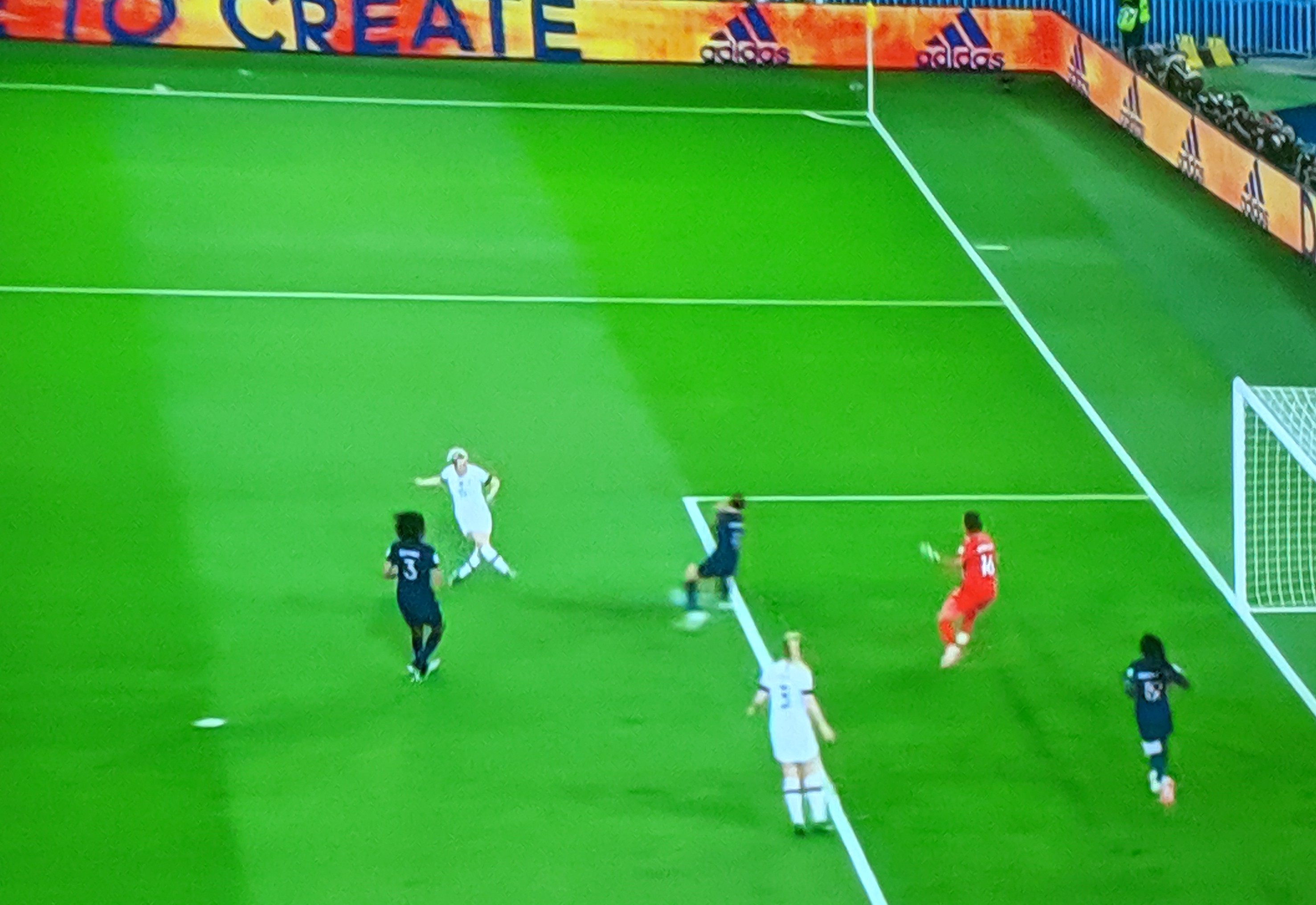 Another close call came in the 16th minute as Thiney, Bussaglia made a run in the American half, were dispossessed and Rapinoe took on the deflection making an unopposed run right through the French half, but the Bouhadii sensed it and ran outside the box to challenge Rapinoe with a sliding tackle-, dispossessed her and shot the ball to safety for an Outside! Close and clever!