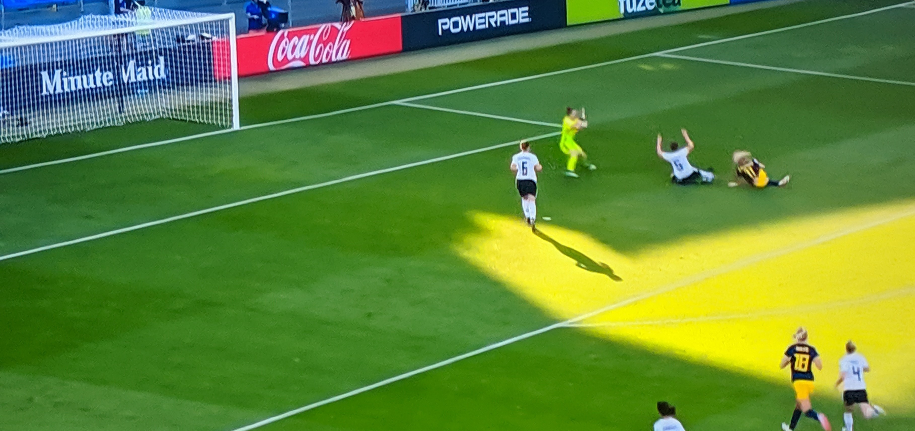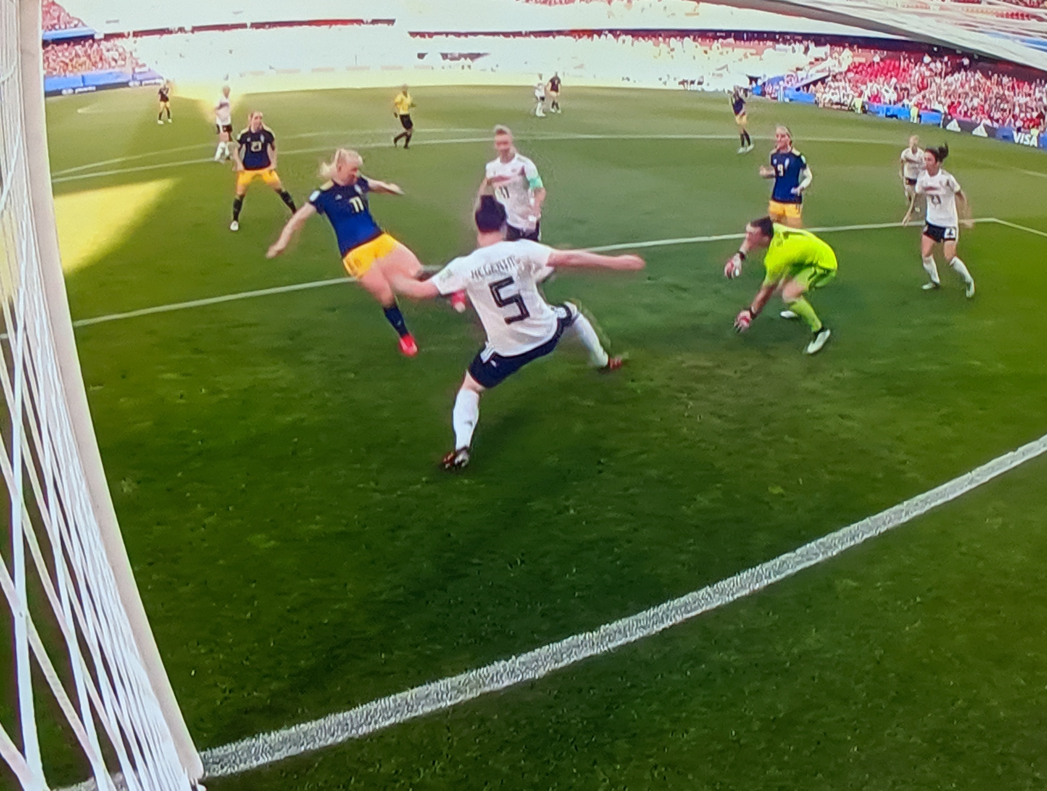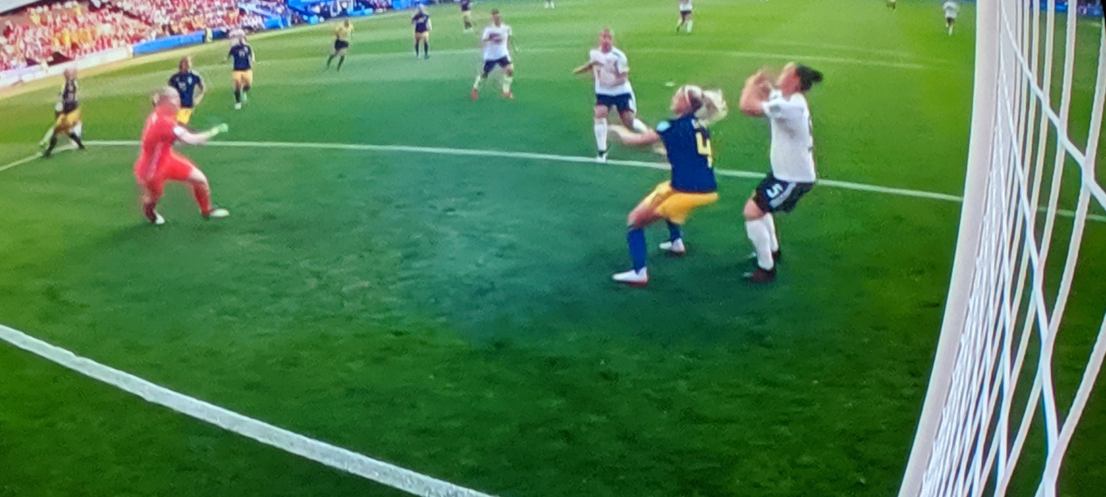 42nd minute brought some nail-biting moments as Sweden got a corner, the first header was saved but displaced Schult from her Position leaving the net open, another header came in but headed away by the German defense, a few more heads and passes finally reaching Lindahl to send it back in play.