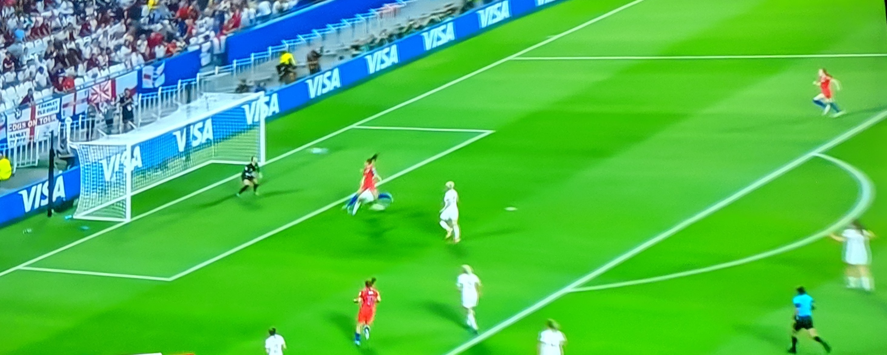 44th minute saw English No. 2 Lucy Bronze intercept a pass to USA No. 9 Horan, ran with the wind, outran Dunn and finally won a corner kick which was shot wide right behind the other side of the net!
