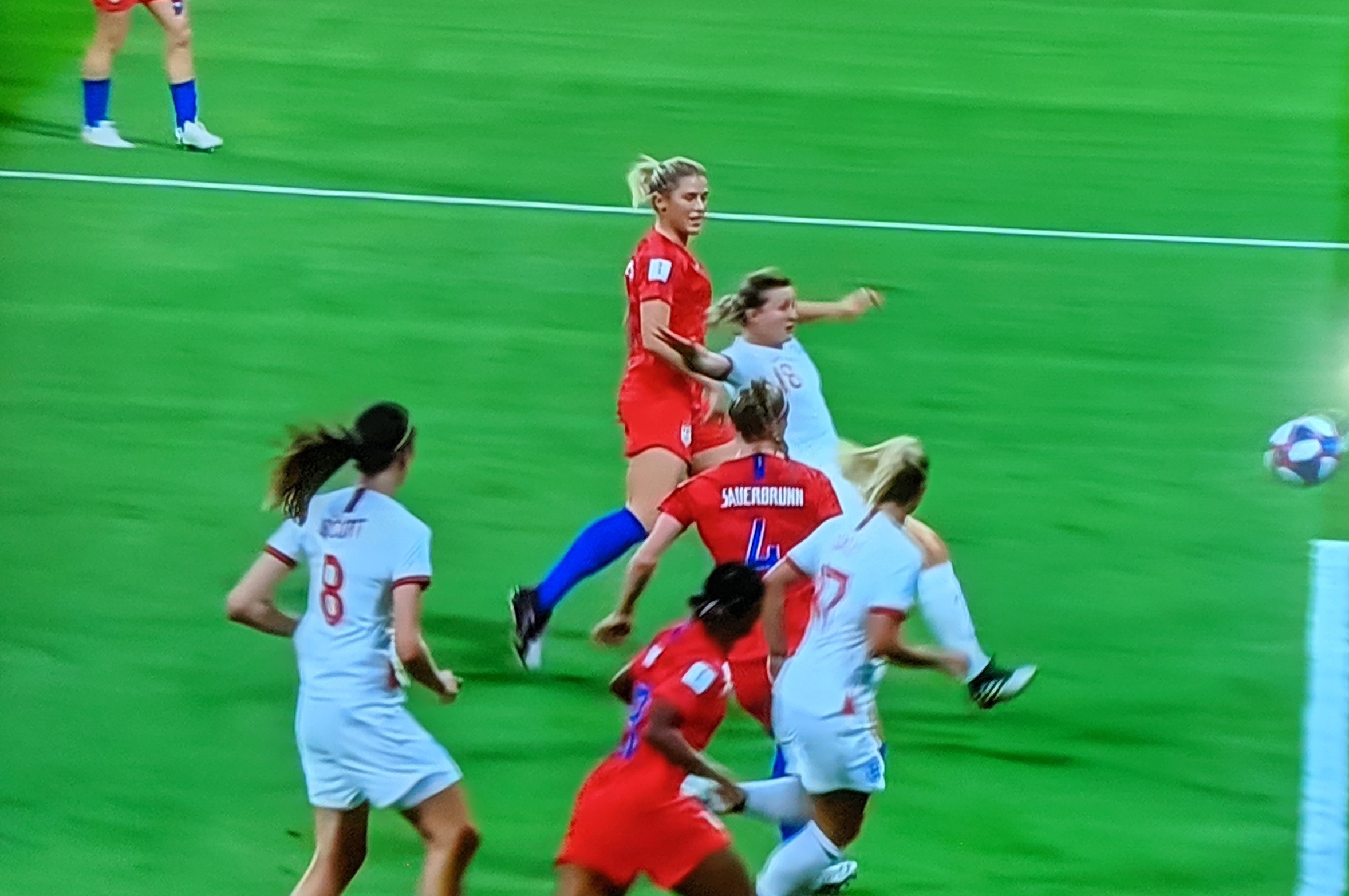 27th minute saw English No. 2 Lucy Bronze move through the defense, Mead got the ball but slipped and won an outside. Walsh sent it in, but US No. 4 Sauerbrunn got to it, shinned it dangerously close but safely away from the goal !